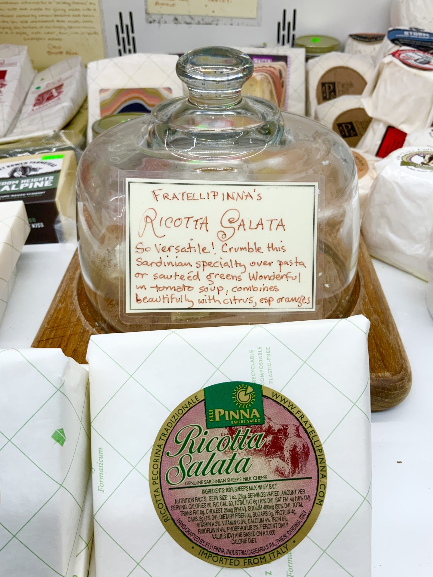 Happy free cheese sample Thursday! Here is a chance to try something new and delicious, Ricotta Salata. This sheep’s milk cheese is imported from Sardinia, Italy and is astonishingly affordable. This versatile, light specialty is unlike ricotta. “Salata” mean’s salted. It is then pressed and dried, so it is firm yet tender and snowy white and beautiful. It is great in pasta dishes, over veggies and in salads. Our cheesemonger, Elizabeth says that it tastes wonderful in tomato soup and pairs well with citrus, especially oranges. Come and treat yourself to something new!