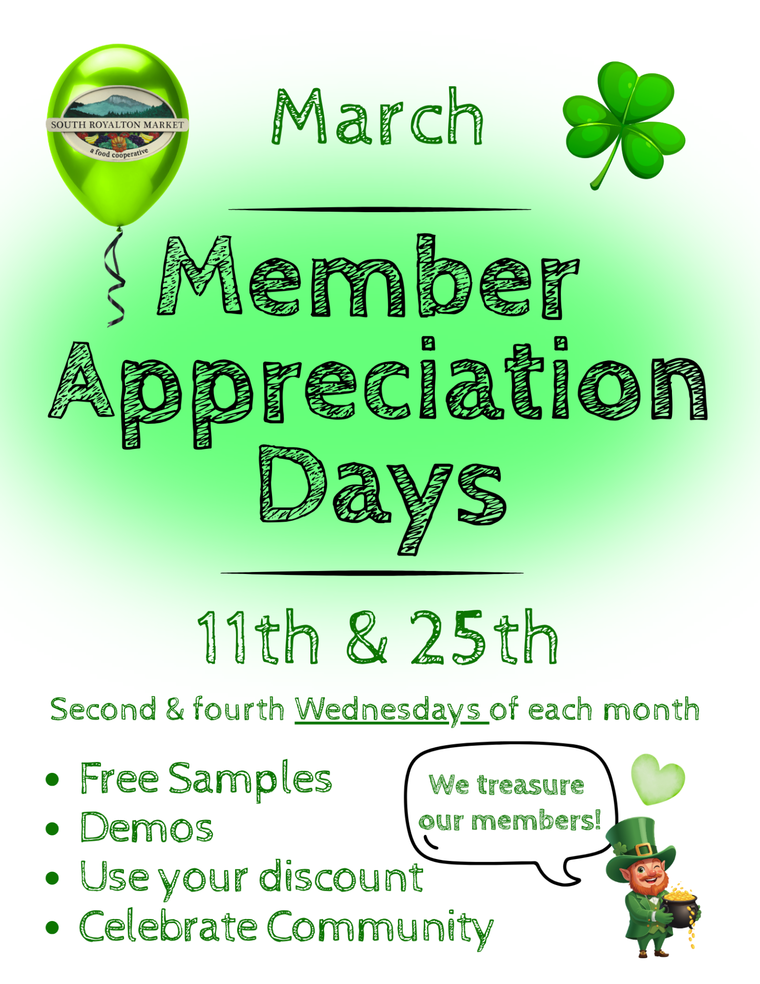 Member Appreciation Days are twice-monthly celebrations of our members and community, held on the 2nd and 4th Wednesdays of each month. They include free samples, snacks, and local vendor demos—just like before 2020.