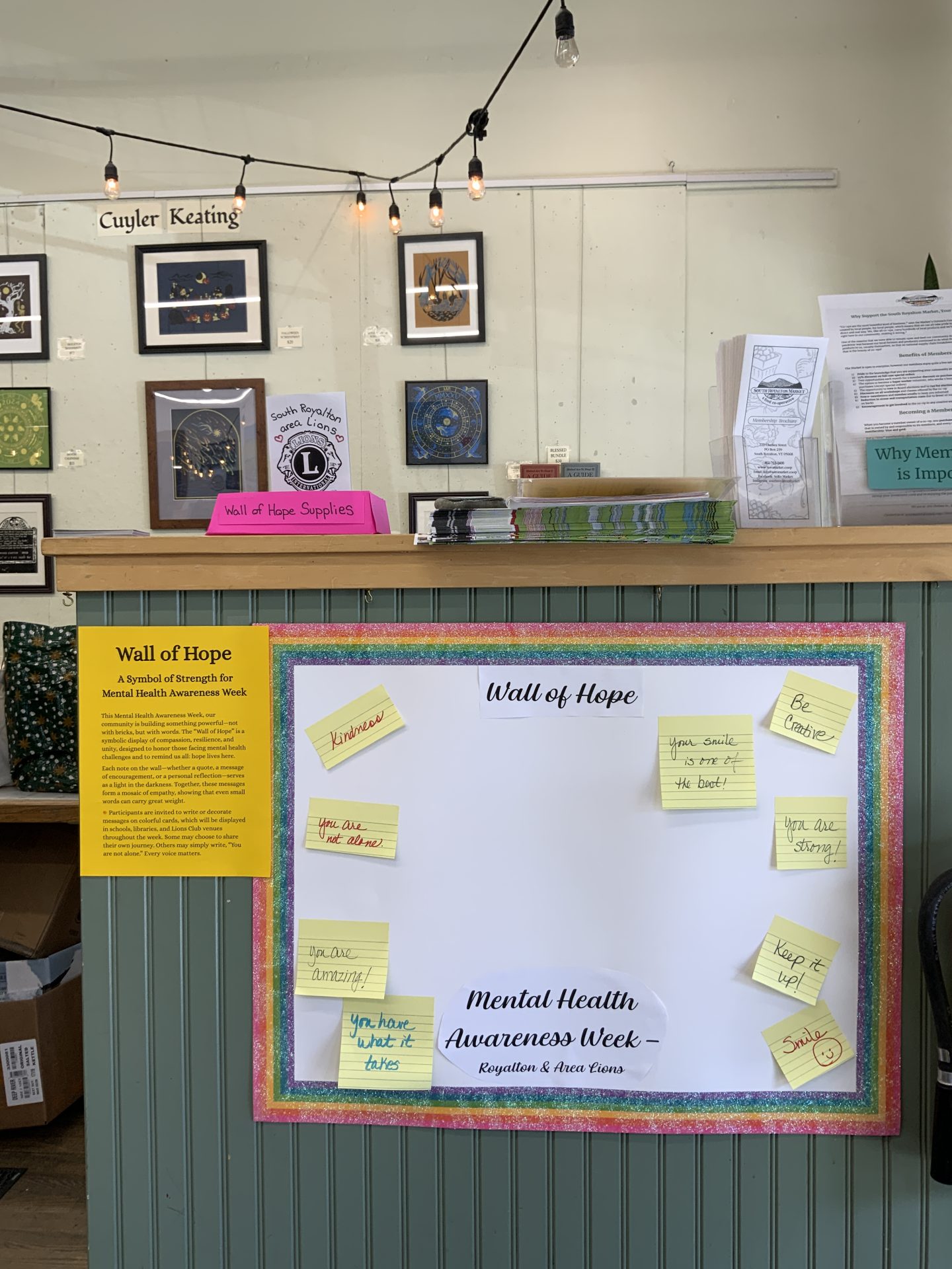 It’s National Mental Illness Awareness Week and we have posted a “Wall of Hope” poster for the Royalton Area Lions Club for our community. The purpose is to leave messages
